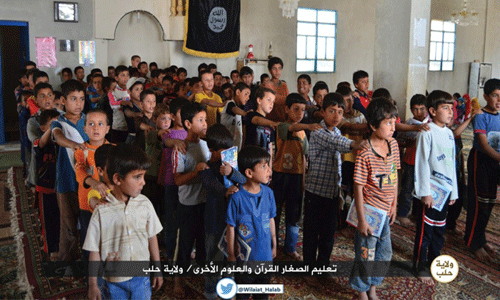 داعش بعد از استقرار در مناطق اشغالی سوریه، اقدام به برگزاری کلاس هایی برای کودکان و نوجوانان کرده است تا آنها را جذب خود کند. در این تصویر ، یکی از کلاس های داعش در "حلب" را می بینید.