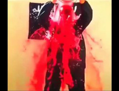 یکی از اعضای گروه تروریستی داعش در حالی که لباس سیاه بر تن داشت و پرچم داعش نیز پشت سر وی دیده می شد، سطلی پر از خون را بر سر خود خالی کرد.