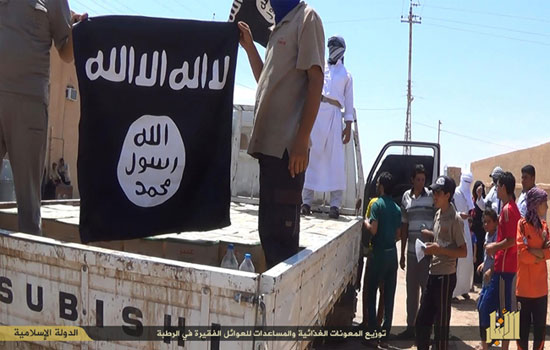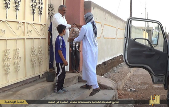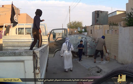 وب سایت الانبار وابسته به گروه تروریستی داعش امروز عکس هایی منتشر کرد که در آن مردانی با پرچم و نشان داعش در بین مردم الرطبه در استان الانبار عراق مواد خوراکی و مایحتاج زندگی توزیع می کنند.