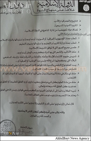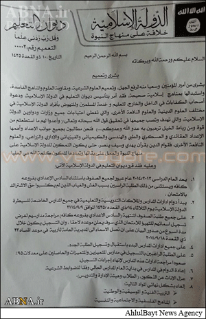 داعش تصریح کرد نام جمهوری عراق و سوریه از تمامی مدارس، دانشگاه‌ها و کتب درسی حذف شده و نام دولت اسلامی جایگزین آن می‌شود و وزارت آموزش و پرورش نیز به دیوان آموزش تغییر نام می‌یابد.