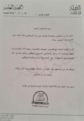 در این بخشنامه آمده است که «کمیته سراسری (داعش) تصمیم گرفت که تصویربرداری با موبایل و دوربینها و دیگر وسائل را به هنگام غزوات یا آنچه با جنگها ارتباط دارد، منع کند تا مانع برداشتهای نامناسب شود و خاطیان تحت پیگیری قرار میگیرند».