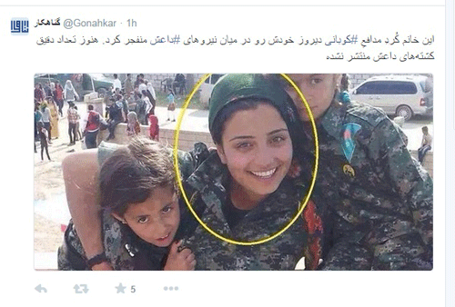 یکی از کاربران توئیتر با انتشار تصویر زیر نوشت : این خانم کُردِ مدافعِ #کوبانی دیروز خودش رو در میان نیروهای #داعش منفجر کرد. هنوز تعداد دقیق کشتههای داعش منتشر نشده است.