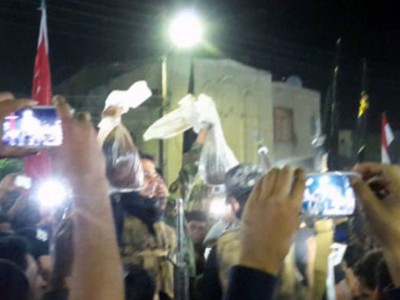 مراسم ختم یکی از کشته شدگان جنگ با داعش، با رونمایی از سرهای بریده اعضای داعش همراه شد.