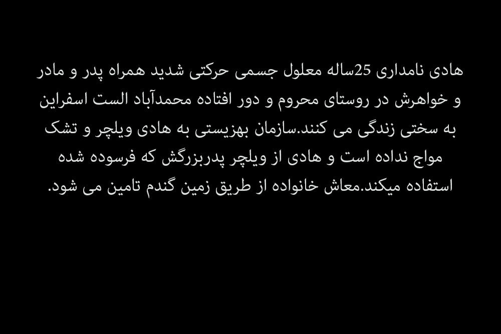 صدای ایران - هادی نامداری 25 ساله معلول جسمی حرکتی شدید همراه پدر و مادر و خواهرش در روستای محروم و دور افتاده محمدآباد است اسفراین به سختی زندگی میکنند.